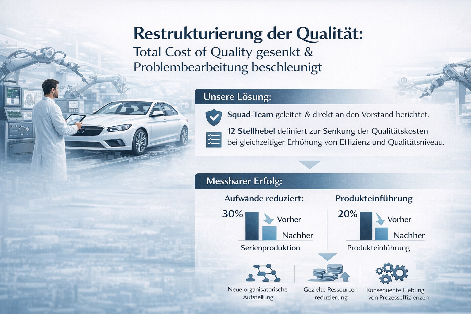 Ein Premium-Automobilhersteller wollte den Bereich Qualität grundlegend restrukturieren, um die Total Cost of Quality zu senken und die Problembearbeitung zu beschleunigen.